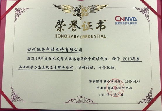 原標題: 迪普科技榮獲“2019年度漏洞報送專項獎”
