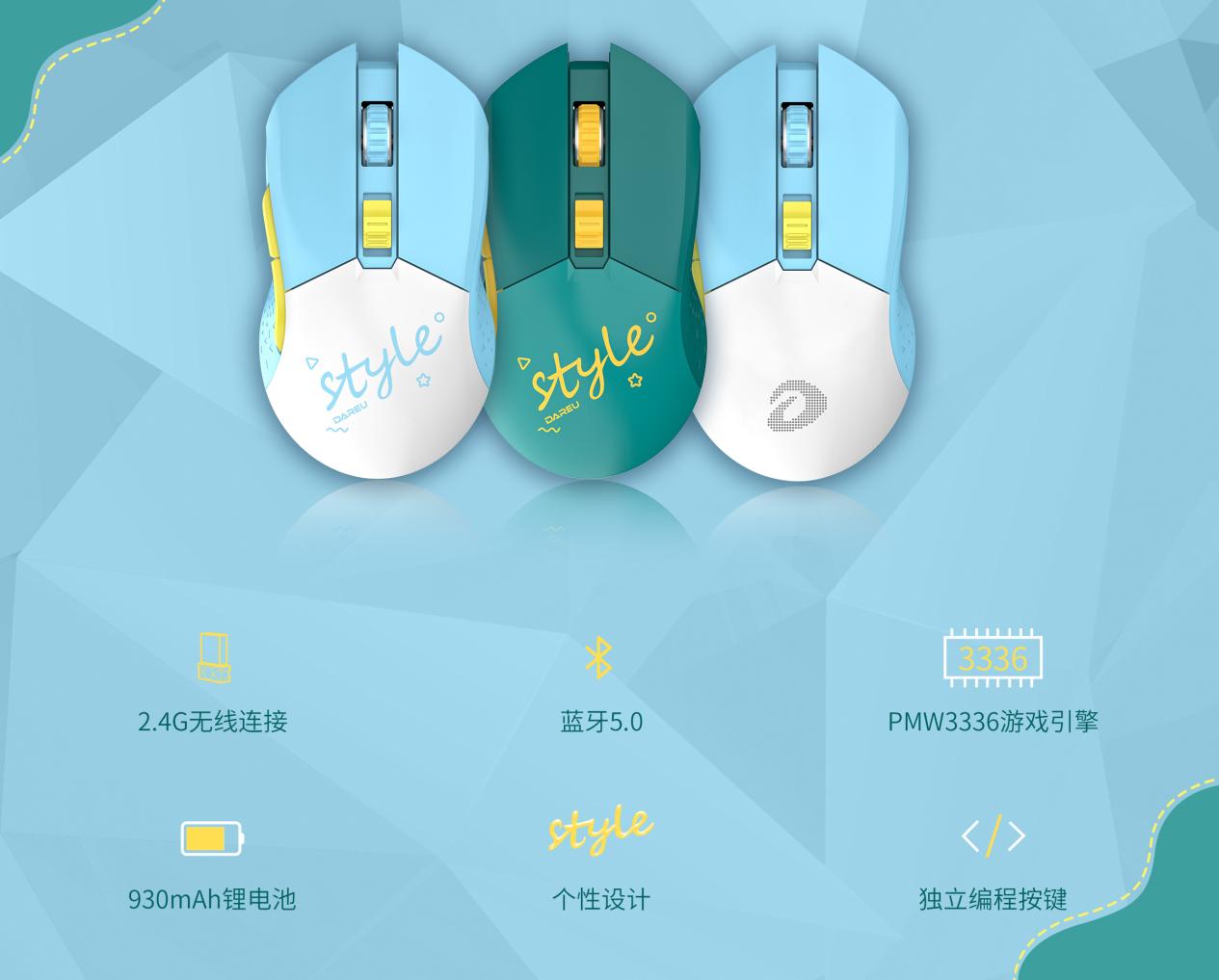 藍牙5.0+2.4G雙無線,辦公游戲新體驗。達爾優EM901雙模無線游戲鼠標擁有孔雀綠和冰晶藍兩種個性外觀設計;采用2.4G與藍牙5.0的雙無線連接模式。通過底部切換按鈕即可輕松切換連接模式,辦公游戲盡在一鍵之間。