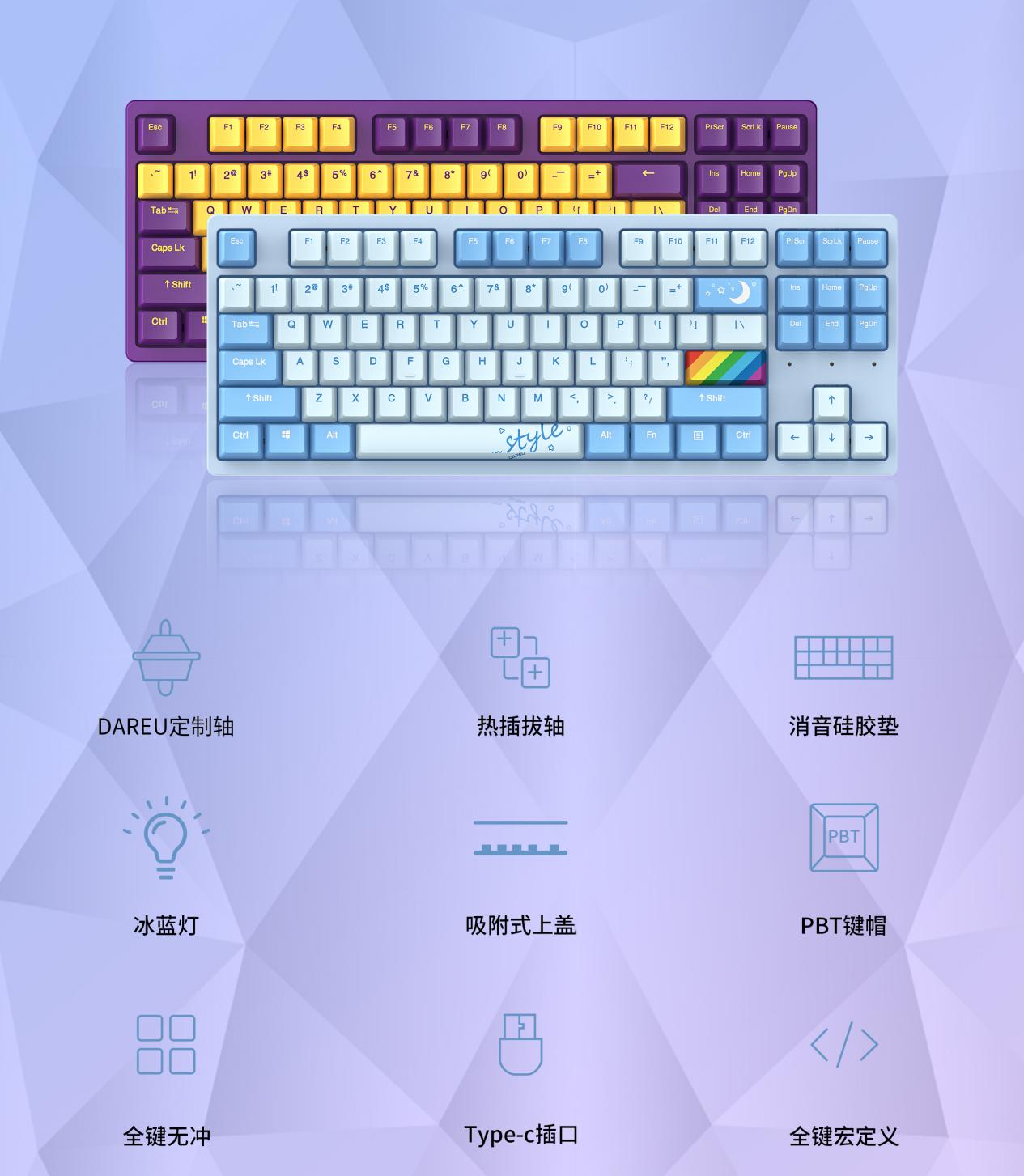 輕松全方位自定義,你也能成為機械鍵盤DIY達人。采用可更換磁吸上蓋設計與兼容市面上大多數鍵帽的達爾優定制軸,百變外觀由你定義;全鍵位軸體熱插拔設計是你桌面上的87key試軸器,專屬機械鍵盤手感隨心定制。