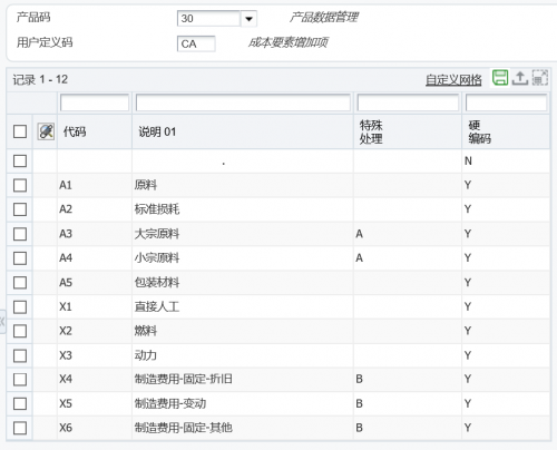 c、成本要素定義:借用JDE標(biāo)準(zhǔn)的額外成本要素X定義客戶需要關(guān)注的成本要素分類,例如在筆者實(shí)施的客戶中就使用了多達(dá)6種的工、費(fèi)成本要素;