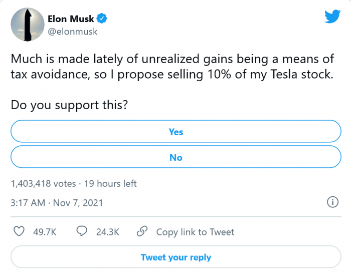 馬斯克在推文中寫道:「最近有很多人說未實現的收益是避稅的一種手段,所以我提議賣掉我 10% 的特斯拉股票,你支持這樣做嗎?」馬斯克是世界上最富有的人之一,他在推文中加入了一個「是」或「否」的投票。另外,他還表示,無論投票結果如何,他都會遵守這個投票結果。
