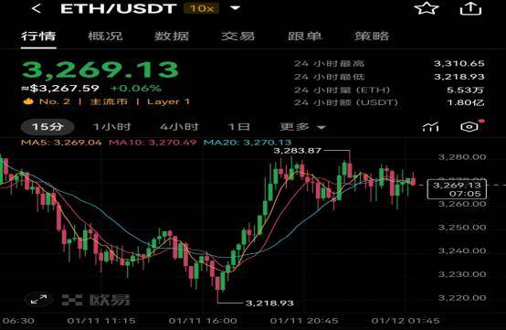 在數字貨幣市場持續波動的背景下,以太坊ETH作為主流加密貨幣之一,其價格走勢和市場動態一直備受關注。截至2025年1月12日,以太坊ETH最新價格為$3,269.13,較前一日略有上漲,漲幅為0.06%。24小時內,以太坊ETH的最高價格達到了$3,310.65,最低價格則為$3,218.93,24小時成交量(ETH)為5.53萬,成交額(USDT)達1.80億。