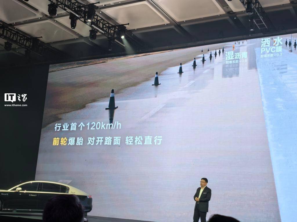 演示過程中,尊界S800在極端條件下展現出了驚人的穩定性。當車輛在濕滑路面上遭遇前輪爆胎的緊急情況時,無需駕駛員操控方向盤,車輛依然能夠保持直線行駛,未出現明顯的偏移現象。更為驚人的是,即便在時速高達120km/h的情況下,尊界S800在左前輪爆胎后,依然能夠保持穩定行駛,避免了失控的風險。