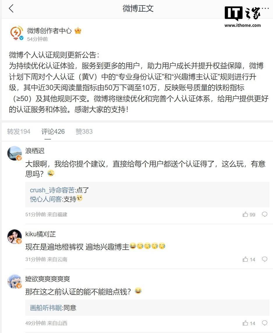 微博個人認證門檻再調整,專業博主閱讀量要求大幅降低