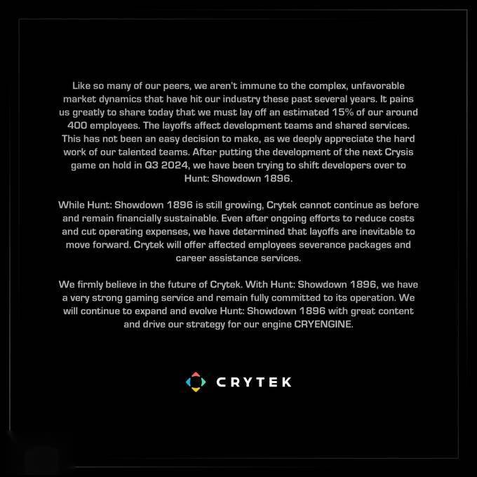 Crytek裁員15%,《孤島危機4》開發擱淺,游戲行業寒冬持續?