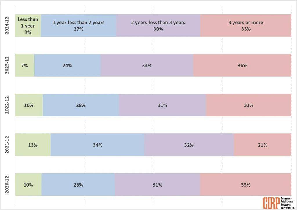 與此同時(shí),使用iPhone三年或更長(zhǎng)時(shí)間的用戶比例從2023年的33%略有下降,而使用兩到三年的用戶比例也從30%有所下降。這兩個(gè)用戶群體的變化相對(duì)均衡,且目前的舊手機(jī)使用模式與2020年頗為相似。
