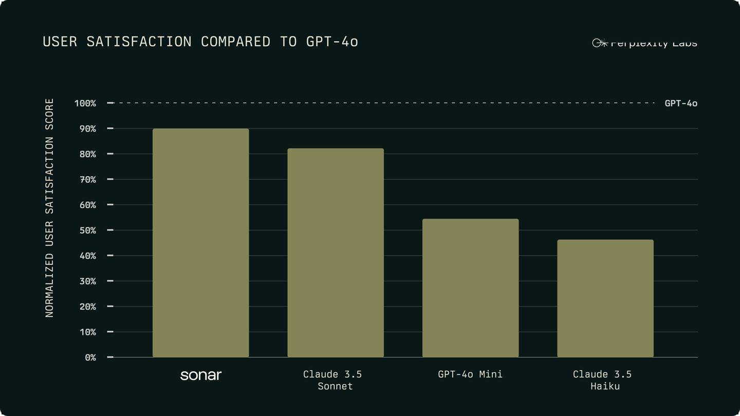在回答質量方面,新版Sonar同樣表現出色。Perplexity表示,用戶對新版Sonar的評價顯著超越了GPT-4o mini和Claude 3.5 Haiku,甚至與前沿模型Claude 3.5 Sonnet相比也毫不遜色,與GPT-4o的差距更是微乎其微。