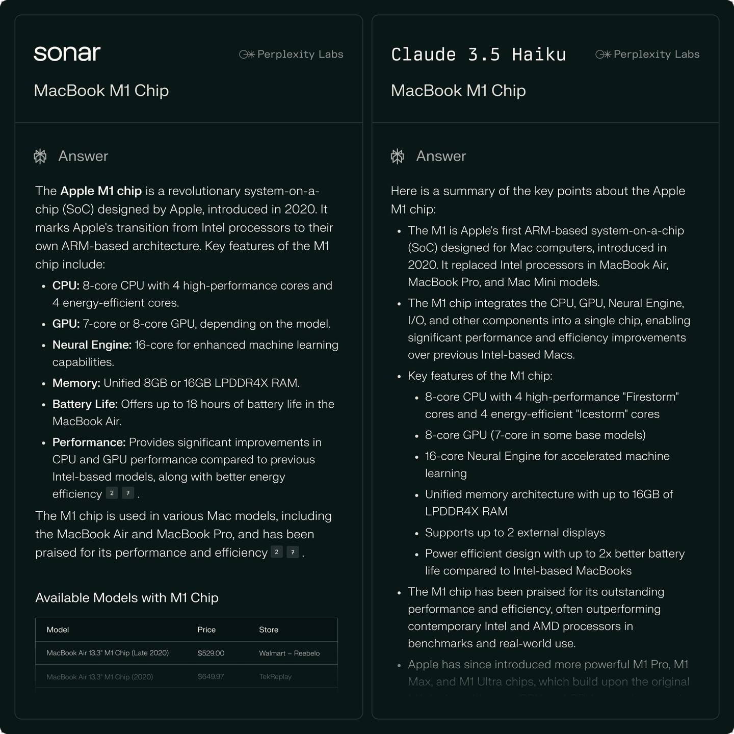 新版Sonar的兩大核心競爭力在于其卓越的事實性回答能力和對markdown格式的熟練運用。這不僅確保了回答的準確性,還大大提升了文本的可讀性,為用戶帶來了更加清晰、直觀的搜索體驗。
