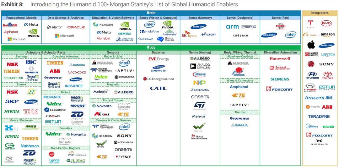 摩根士丹利近期發布了題為《人形機器人 100:探索人形機器人價值鏈》的深度報告,該報告揭曉了全球人形機器人產業鏈上的百強企業名單,為業界提供了寶貴的洞察。