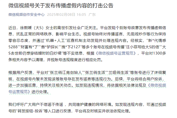 與此同時,微信視頻號內也涌現了一批傳播不實信息的賬號,如“新*代情感5288”、“財富有*了”、“傲*驢探長”以及“拽*下2127”等。這些賬號發布了諸如“汪小菲寫給大S的信”以及“大S去世前仍想穿結婚時的白紗裙”等虛假內容,嚴重誤導了公眾。微信視頻號依據《微信視頻號運營規范》,對相關內容進行了及時清理,并根據賬號違規程度給予了相應處罰。