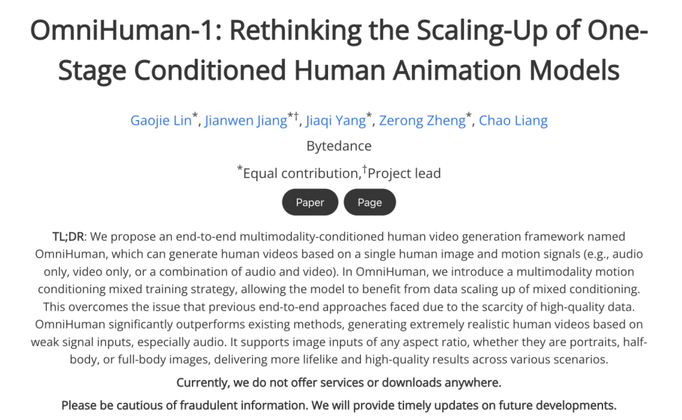 根據(jù)技術(shù)主頁展示的演示效果來看,OmniHuman的生成效果已經(jīng)具有較高的自然度。為防止該項(xiàng)技術(shù)被不當(dāng)利用,字節(jié)跳動(dòng)技術(shù)團(tuán)隊(duì)在主頁中特別標(biāo)注稱,OmniHuman將不會(huì)對(duì)外提供下載。