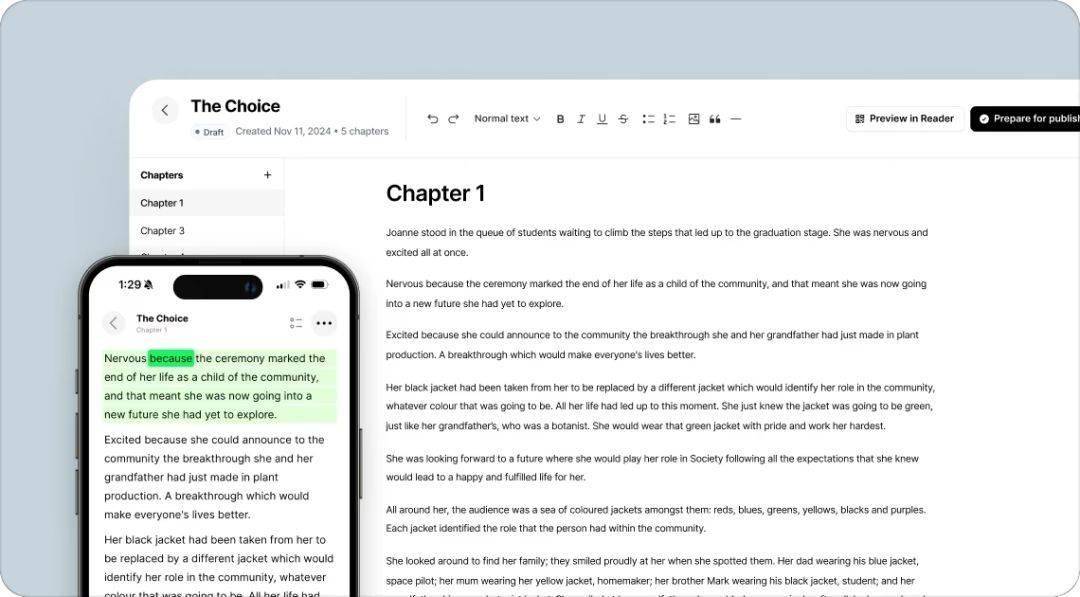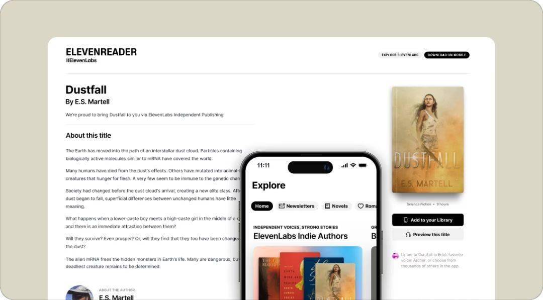 ElevenReader Publishing平臺的推出,正是為了解決這一問題。它賦予了作者更多的控制權,包括語音定制、節奏調整以及多角色配音等功能,讓作者能夠根據自己的需求,打造出獨一無二的有聲書。