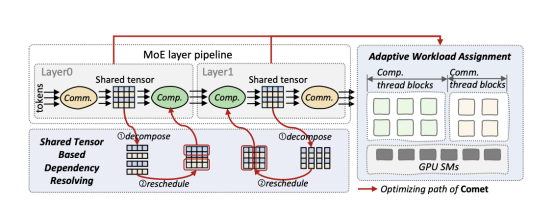 具體而言, COMET 從系統(tǒng)層面建立了面向 MoE 的細粒度流水線編程方式,通過引入共享張量依賴解析、自適應負載分配兩項關鍵機制,來解決通信與計算之間的粒度錯配問題,并精準平衡通信與計算負載,最終大幅提升MoE流水線整體效率。 引入COMET后,單個 MoE 層上可實現(xiàn) 1.96 倍加速、端到端平均 1.71 倍效率提升,且在不同并行策略、輸入規(guī)模及硬件環(huán)境下均表現(xiàn)穩(wěn)定。