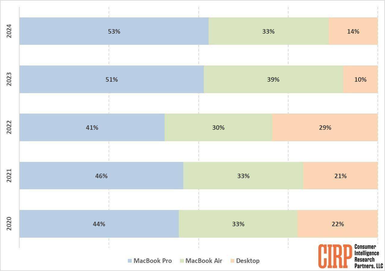 數據顯示,2024年在美國市場,MacBook系列占據了蘋果Mac電腦總銷量的86%,其中MacBook Pro的表現尤為突出,占據了53%的市場份額。這一數據無疑凸顯了MacBook Pro在專業用戶群體中的深厚基礎。