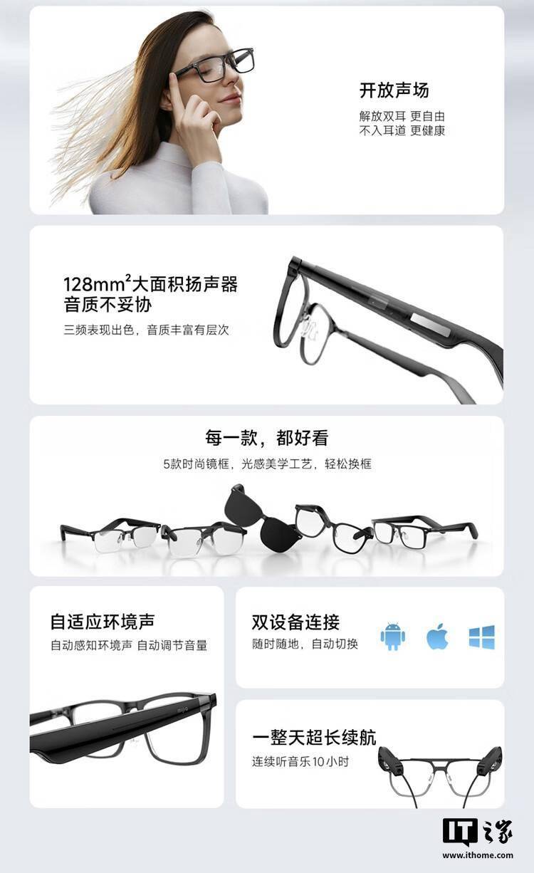 在功能方面,初代MIJIA智能音頻眼鏡同樣表現出色。它采用了開放聲場技術,支持360度環繞音效,為用戶帶來了沉浸式的聽覺體驗。同時,它還配備了128平方毫米的超動態平衡揚聲器以及SBS2.0雙懸掛平衡結構,確保了音質的清晰和穩定。該產品還搭載了雙麥波束AI通話降噪算法,有效提升了通話質量,并支持智能增強通話和雙設備連接功能,讓用戶能夠輕松應對各種通話場景。