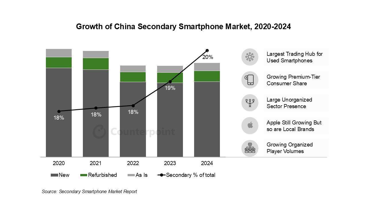中國二手智能手機市場近日迎來了新的關注焦點。據(jù)知名市場研究機構(gòu)CounterPoint Research最新發(fā)布的報告,2024年,中國二手智能手機市場(涵蓋翻新與二手設備)已占據(jù)全國智能手機總銷量的五分之一,這一比例顯示出二手手機市場的蓬勃生機。