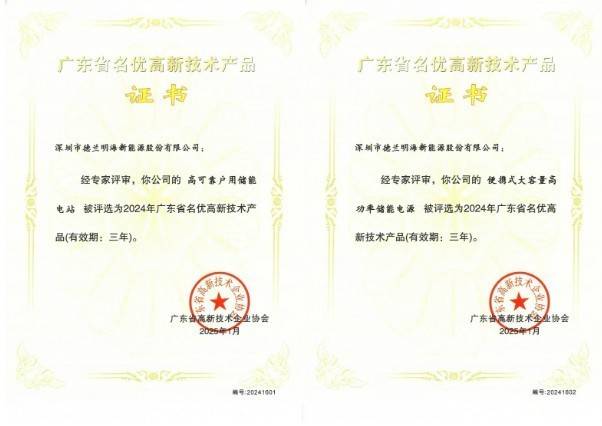 在新能源領域的科技創新浪潮中,深圳市德蘭明海新能源股份有限公司再次傳來捷報。近日,廣東省高新技術企業協會正式揭曉了2024年度廣東省名優高新技術產品名單,德蘭明海旗下的兩大明星產品——高可靠戶用儲能電站與便攜式大容量高功率儲能電源,憑借其前沿技術實力與卓越市場表現,成功躋身榜單,贏得了業界的廣泛贊譽。