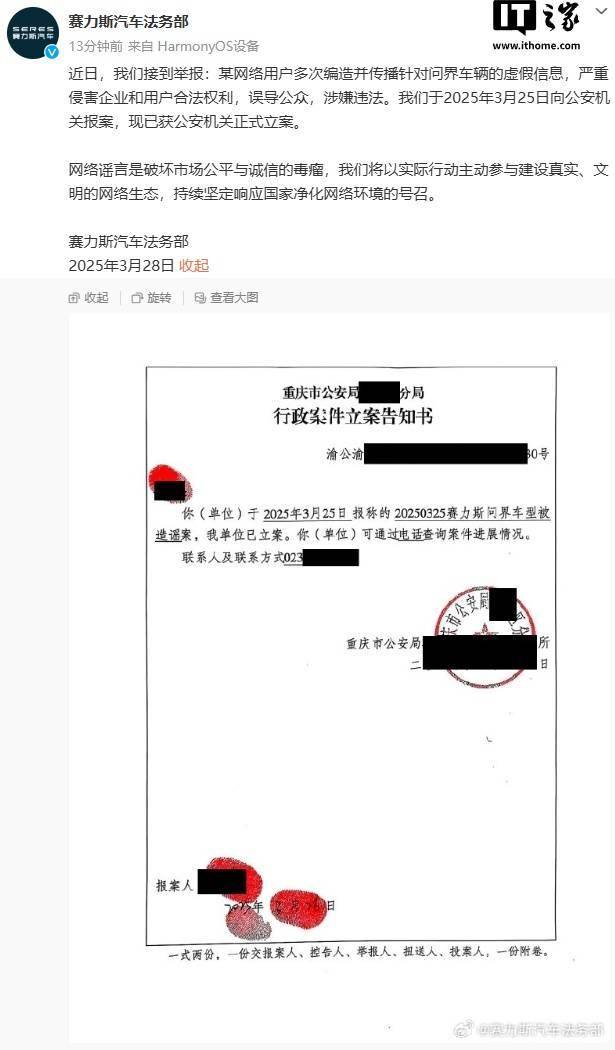 賽力斯汽車法務(wù)部:嚴(yán)正聲明,問(wèn)界車輛謠言已立案調(diào)查