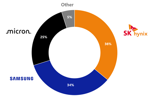 在報告所覆蓋的這一季度內,SK海力士在DRAM市場的營收占比高達36%,緊隨其后的是三星電子,其市占率為34%。而美光科技則以25%的市場份額排在第三位,其余廠商共同占據了剩余的5%市場。