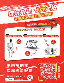作為賽事合作伙伴,京東不僅攜手行業(yè)領(lǐng)軍企業(yè)打造人機(jī)雙賽道競技比賽,4月20日晚八點(diǎn),京東拍賣還將推出人形機(jī)器人1元起拍活動(dòng),打破高端科技產(chǎn)品與大眾消費(fèi)市場的傳統(tǒng)壁壘,構(gòu)建起科技普惠的新場景,讓尖端科技成果通過拍賣這種全民參與的玩法走進(jìn)尋常百姓家。即日起,上京東搜索“京東拍賣”即可預(yù)約并享受專屬提醒,所有用戶皆可圍觀參與。
