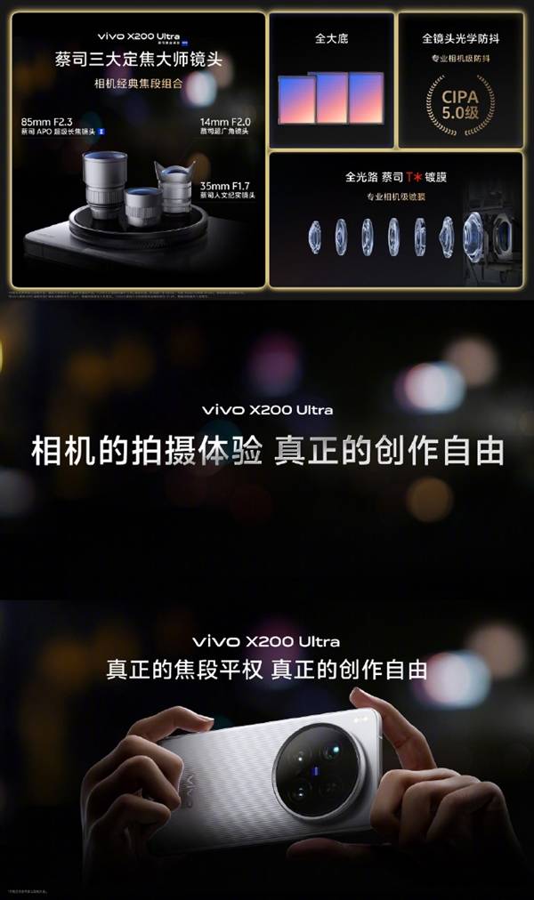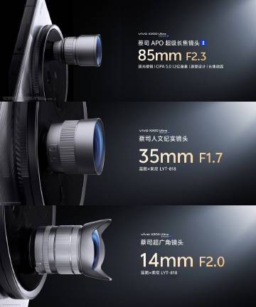 除了長焦鏡頭的升級,X200 Ultra還配備了兩顆藍圖×索尼LYT-818鏡頭,分別覆蓋35mm焦段的超廣角和主攝功能。vivo強調,X200 Ultra實現了“一機三鏡”的攝影理念,即不再區分主攝和副攝,所有鏡頭均采用大底傳感器,覆蓋全焦段,并全部經過蔡司認證。
