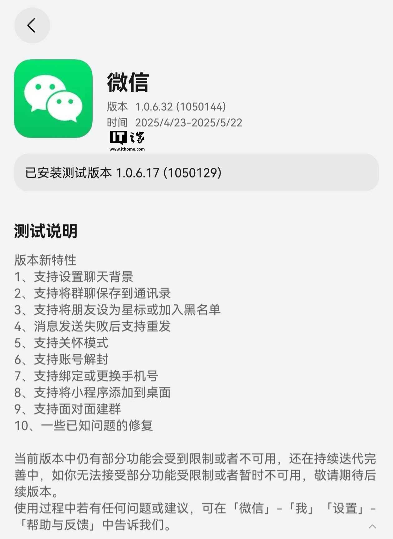測(cè)試說(shuō)明中詳細(xì)列出了新版本所支持的功能,包括設(shè)置聊天背景、將群聊保存到通訊錄、將朋友加入黑名單、消息發(fā)送失敗后的重發(fā)功能、關(guān)懷模式、賬號(hào)解封、綁定或更換手機(jī)號(hào)、將小程序添加到桌面、面對(duì)面建群等。還對(duì)一些已知問(wèn)題進(jìn)行了修復(fù)。