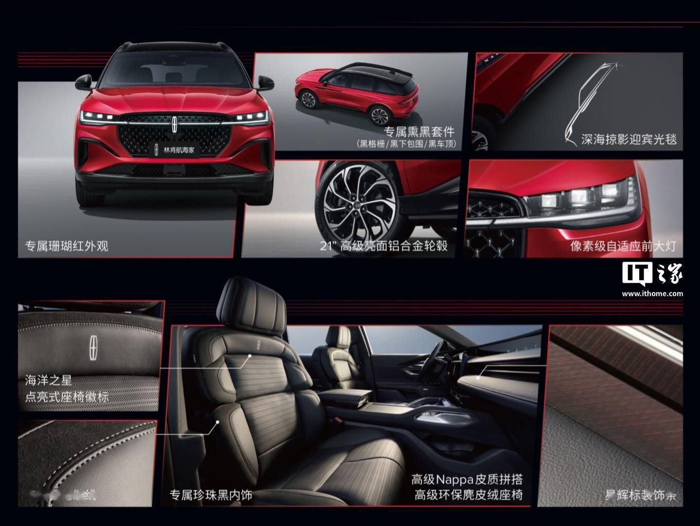 在外觀設計上,航海家亞特蘭蒂斯版采用了林肯標志性的設計元素,包括一體式貫穿頭燈和隱藏式門把手,車尾則配備了流行的貫穿式尾燈。珊瑚紅的專屬車漆與熏黑套件相得益彰,21英寸輪轂和迎賓光毯等細節配置,進一步提升了車輛的豪華感和辨識度。