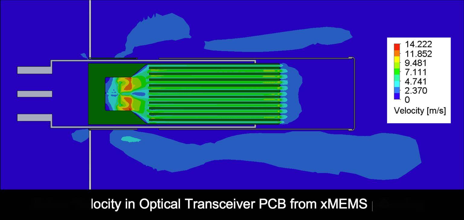 在xMEMS的概念設(shè)計中,μCooling芯片風(fēng)扇被巧妙地安置在DSP單元所在PCB板的背部。這一布局確保了氣流通道與核心光子電路的分離,從而避免了風(fēng)扇運行對硅光系統(tǒng)可能產(chǎn)生的干擾。同時,μCooling風(fēng)扇依然能夠發(fā)揮出卓越的散熱性能,為光模塊的穩(wěn)定運行提供了有力支持。