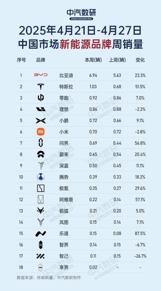 在新能源汽車市場的競爭中,小米汽車也展現出了不俗的實力。根據中汽數研最新公布的銷量數據,在2025年第17周(4月21日至4月27日)的中國汽車市場新能源品牌銷量排名中,小米汽車位列第六,銷量達到了0.70萬輛。這一成績不僅彰顯了小米汽車在新能源汽車領域的市場影響力,也為其未來的發展奠定了堅實的基礎。