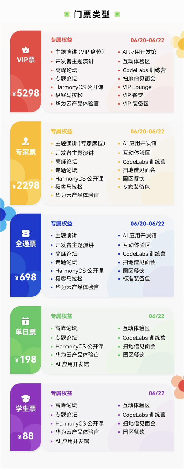 為了滿足不同開發(fā)者的需求,本次大會提供了多種票務(wù)選擇。VIP票售價高達5298元,為高端開發(fā)者提供專屬服務(wù);專家票則為2298元,適合行業(yè)內(nèi)的專業(yè)人士;全通票售價598元,為參會者提供全程參與的機會;單日票198元,適合時間有限的開發(fā)者;而學(xué)生票則僅需88元,充分體現(xiàn)了華為對年輕開發(fā)者的支持與鼓勵。