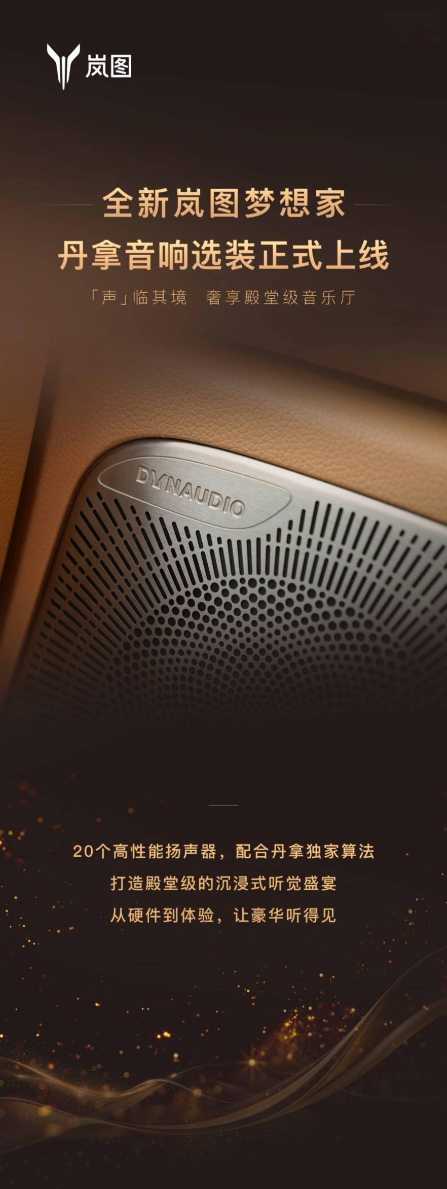 嵐圖汽車近期為其夢想家車型推出了一項新服務——“丹拿音響選裝包”,旨在進一步提升用戶的駕乘體驗。此次推出的選裝包,能夠讓車輛配備多達20個揚聲器,并支持3D沉浸式環(huán)繞聲,為用戶帶來前所未有的聽覺享受。