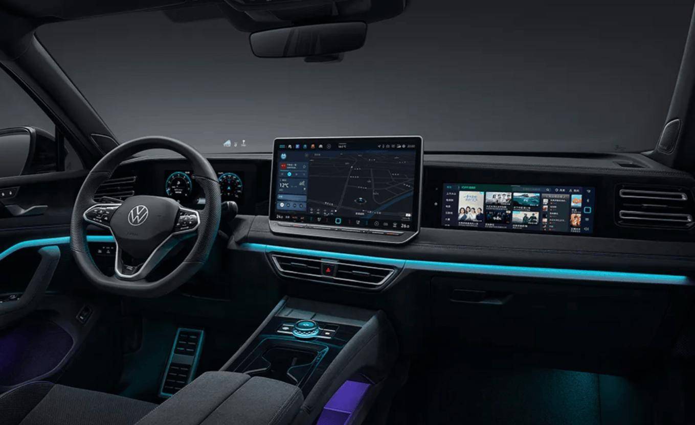 進入車內,新款途觀L Pro的座艙設計同樣令人眼前一亮。中控臺配備了10.3英寸的液晶儀表盤和15英寸的懸浮式中控屏,為駕駛者提供了清晰直觀的車輛信息顯示和豐富的娛樂功能。懷擋式換擋機構的設計也使得整個駕駛區域更加簡潔、易于操作。除入門版車型外,其他款型還額外提供了11.6英寸的副駕娛樂屏,進一步提升了乘客的乘坐體驗。