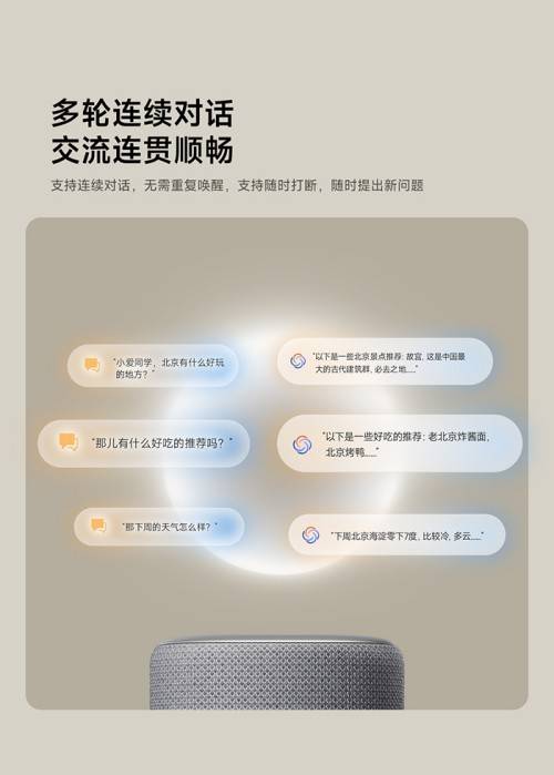 小米智能音箱還扮演著“AI小管家”的角色,它不僅能根據時間提醒母親喝水、吃藥、做家務,還能每天準時推送養生知識,根據天氣變化為母親提供飲食建議,讓母親感受到如同子女陪伴在側的溫暖與關懷。多輪對話功能的加入,更是讓音箱與母親的交流變得自然流暢,仿佛一個真正的聊天伙伴,為母親的生活增添了許多樂趣。