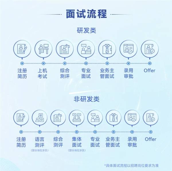 華為還詳細介紹了其招聘實習生的崗位類別和面試流程。今年,華為提供了包括自動化控制工程師、網絡安全與隱私保護工程師、結構與材料工程師、熱設計工程師、AI工程師、涉外律師、技術采購工程師以及財經專員等多個實習崗位。面試流程根據崗位類別的不同而有所區別,研發類崗位需要經過注冊簡歷、上機考試、綜合評測、專業面試、業務主管面試以及錄用審批等環節;非研發類崗位則可能包括語言評測、集體面試等額外環節。
