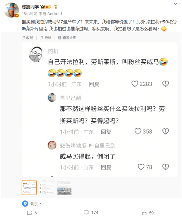 網友們的質疑聲浪中,有人直接指出陳震自己駕駛著法拉利、勞斯萊斯等豪華車型,卻向粉絲推薦了威馬汽車。面對這樣的指責,陳震迅速作出回應,他公開詢問是否有粉絲真的基于他的推薦購買了威馬M7,并表示愿意原價回購。同時,他也反問道:“我同樣推薦過法拉利sf90和勞斯萊斯庫里南,難道也要為這些車的購買負責嗎?”