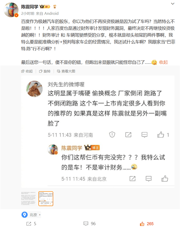“百度作為極越的股東,他們的投資決策并非基于試駕體驗,而是通過嚴格的財務審計。”陳震強調,“駕駛感受的分享與企業的財務狀況分析,完全是兩碼事。如果我真能準確預判車企的經營狀況,那我早就轉行去做投資大師了?!?/p>