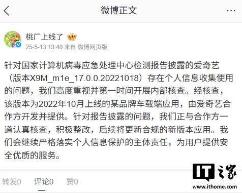 面對這一通報,愛奇藝迅速作出響應。通過其官方發言人@桃廠上線了發布聲明,愛奇藝表示對此事高度重視,并已立即啟動內部核查程序。據聲明所述,被點名的愛奇藝版本(X9M_m1e_17.0.0.20221018)實際為2022年10月上線的一款車載端應用,該應用由愛奇藝的合作方負責開發和提供。