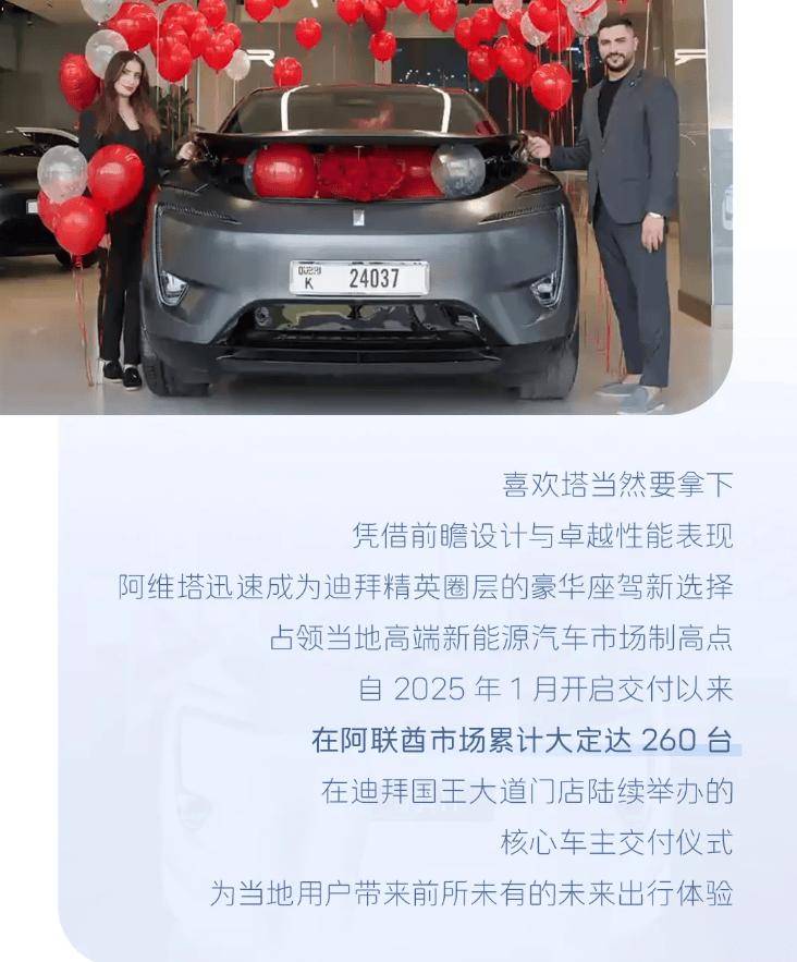 阿維塔汽車在中東市場取得了令人矚目的成績,特別是在阿聯(lián)酋的上市表現(xiàn)尤為亮眼。自2025年初正式交付以來,該品牌在短時間內(nèi)便實現(xiàn)了超過百臺的累計交付量,這一成績使得阿維塔在豪華新能源品牌市場中的占有率高達(dá)8.25%。