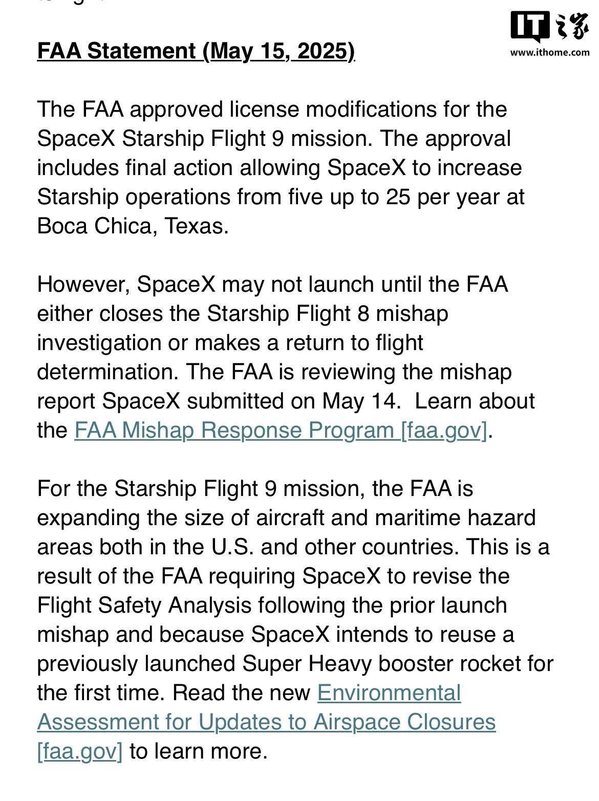 FAA修訂SpaceX星艦第九次試飛許可,IFT-8事故調(diào)查仍懸而未決