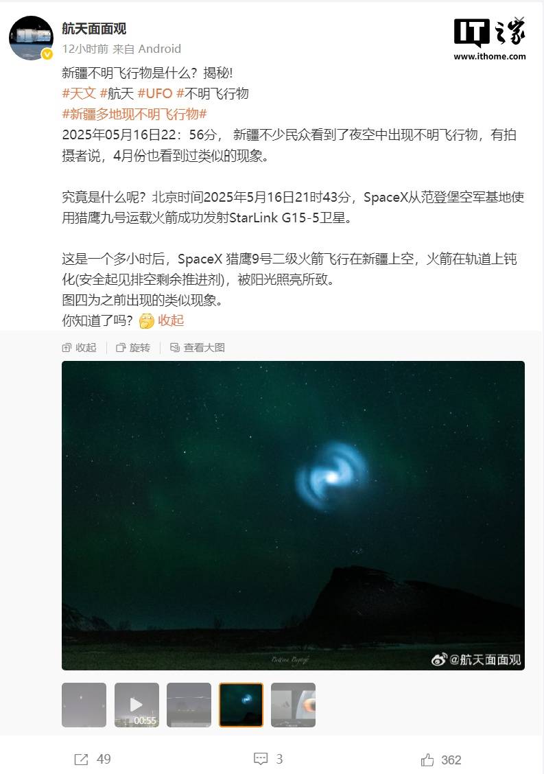 然而,隨著調(diào)查的深入,科普博主@航天面面觀給出了另一種可能的解釋。他提到,在北京時間2025年5月16日21時43分,SpaceX從范登堡空軍基地成功發(fā)射了StarLink G15-5衛(wèi)星。而在一個多小時后,SpaceX的獵鷹9號二級火箭正好飛行在新疆上空。他推測,這很可能是火箭在軌道上鈍化(排空剩余推進劑以確保安全)時,被陽光照亮所產(chǎn)生的景象。