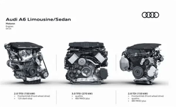 動力方面,海外版全新奧迪A6轎車提供了多款動力系統供消費者選擇。其中,2.0TFSI汽油發動機最大功率為150千瓦,而3.0TFSI汽油發動機的最大功率則達到了270千瓦。新車還配備了quattro四驅系統及48伏MHEV plus輕混系統,提供了出色的動力性能和燃油經濟性。傳動系統方面,2.0TFSI發動機匹配了7速S tronic雙離合變速箱,并提供了quattro ultra全輪驅動系統作為選裝。