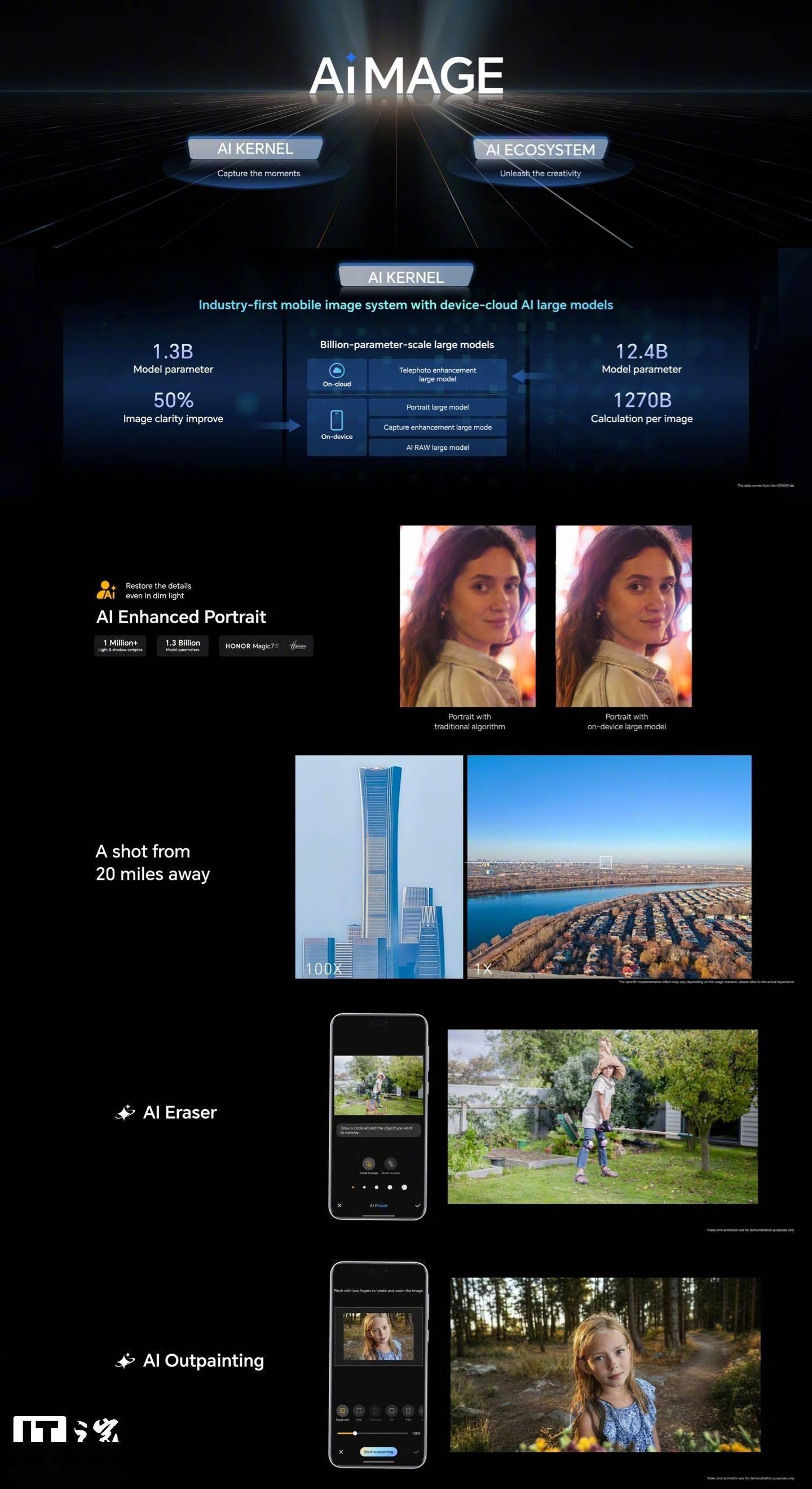 回顧今年3月,榮耀在世界移動通信大會(MWC)上隆重推出了以人工智能為核心的AIMAGE影像品牌,該品牌融合了端云協同的AI KERNEL和全面的AI生態系統。據詳細介紹,端側的大模型技術顯著提升了圖像的清晰度,而云端的大模型則對長焦攝影和AI修圖提供了強大支持,兩者協同工作,共同推動了全場景影像技術的革新。