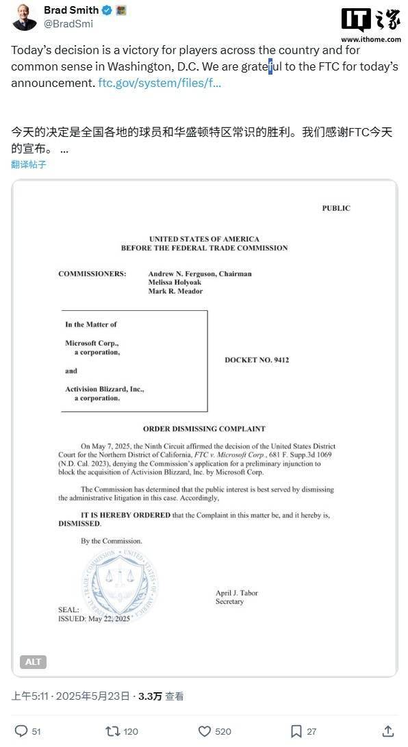 微軟對此表示歡迎。微軟副董事長布拉德·史密斯在回應中表示:“今天的決定是全美玩家和華盛頓理性決策的勝利。我們非常感謝FTC的最終決定,這讓我們能夠繼續推進收購后的整合工作。”