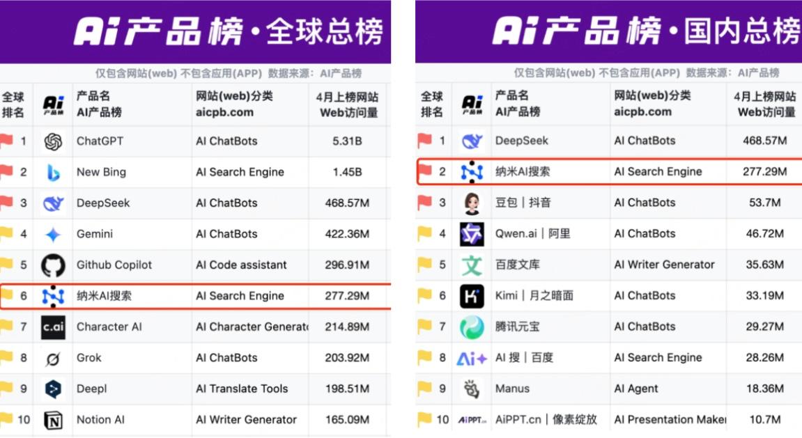 根據最新發布的全球AI產品榜單(2024年4月),納米AI搜索不僅在中國市場排名第一,在全球范圍也位居第二,僅次于微軟New Bing,超越了估值已達140億美元的海外明星AI搜索產品Perplexity。從全球AI Web月活排名來看,中國僅有DeepSeek和納米AI搜索躋身前十。成績背后,是一場低調而持續的深耕。