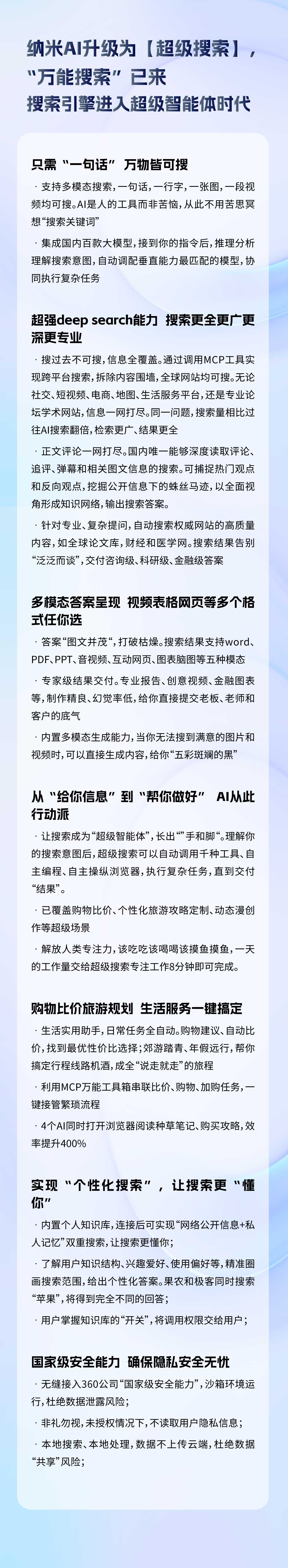 從2024年上線“納米AI搜索”起,360便以平均兩到三周一次的節奏快速迭代:春節期間接入滿血版DeepSeek、隨后陸續接入知識庫、MCP工具箱、Agent能力……到近期發布的“納米AI超級搜索”,幾乎每一次迭代都踩中用戶需求的節奏點。