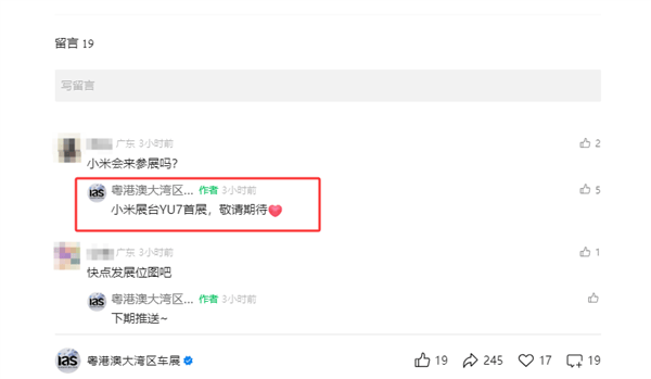 針對(duì)網(wǎng)友關(guān)心的“小米是否會(huì)參展”的問題,“粵港澳大灣區(qū)車展”官方給出了明確答復(fù):“小米展臺(tái)將首次展出YU7,敬請(qǐng)期待。”這一消息無(wú)疑為期待小米新車的消費(fèi)者們帶來(lái)了好消息。