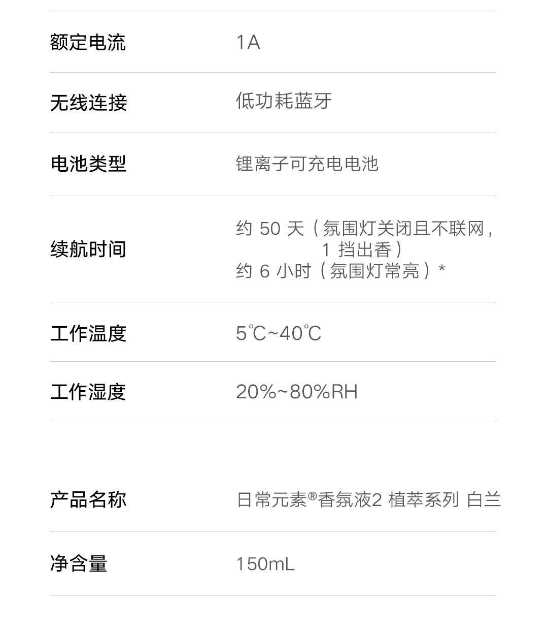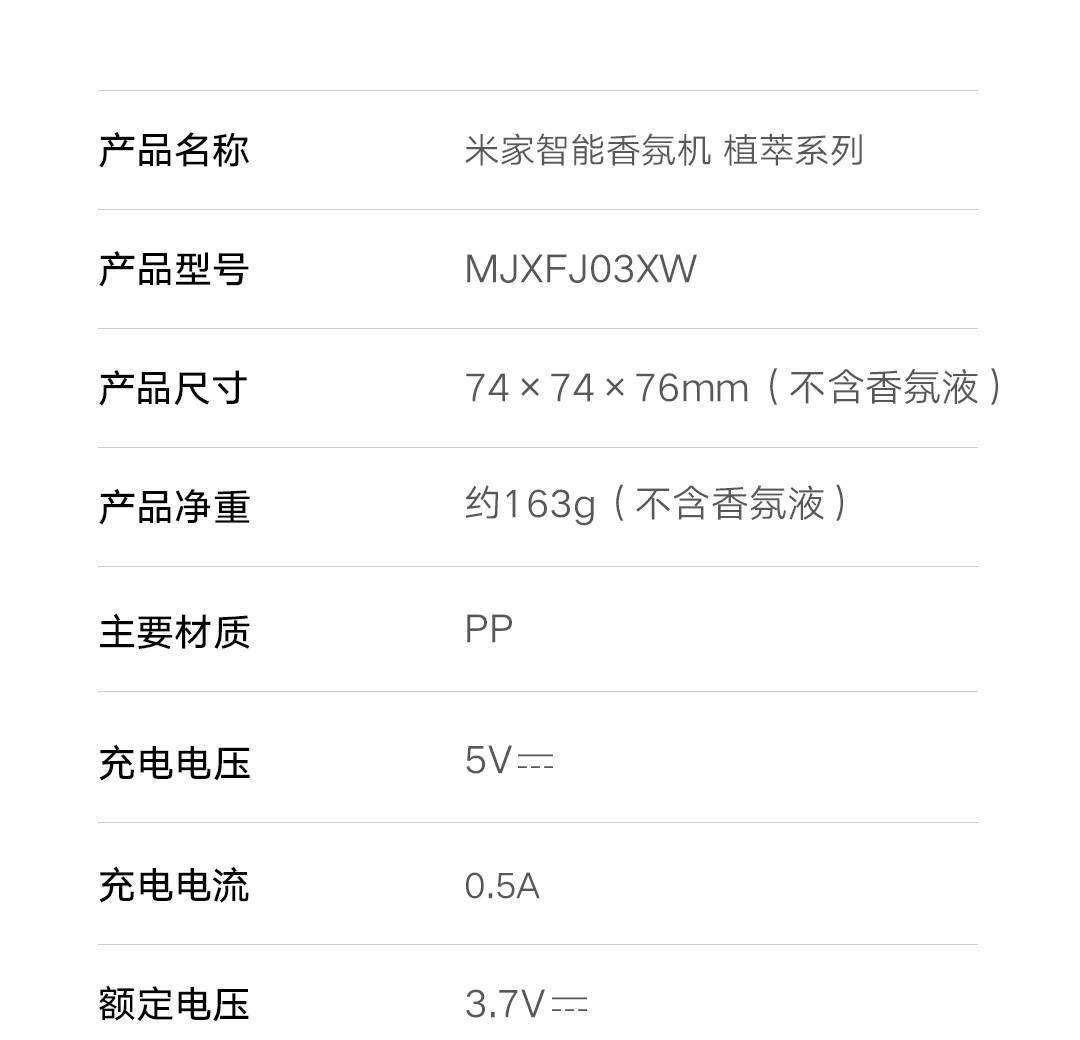 以下是米家智能香氛機套裝的詳細規格參數,供用戶參考: