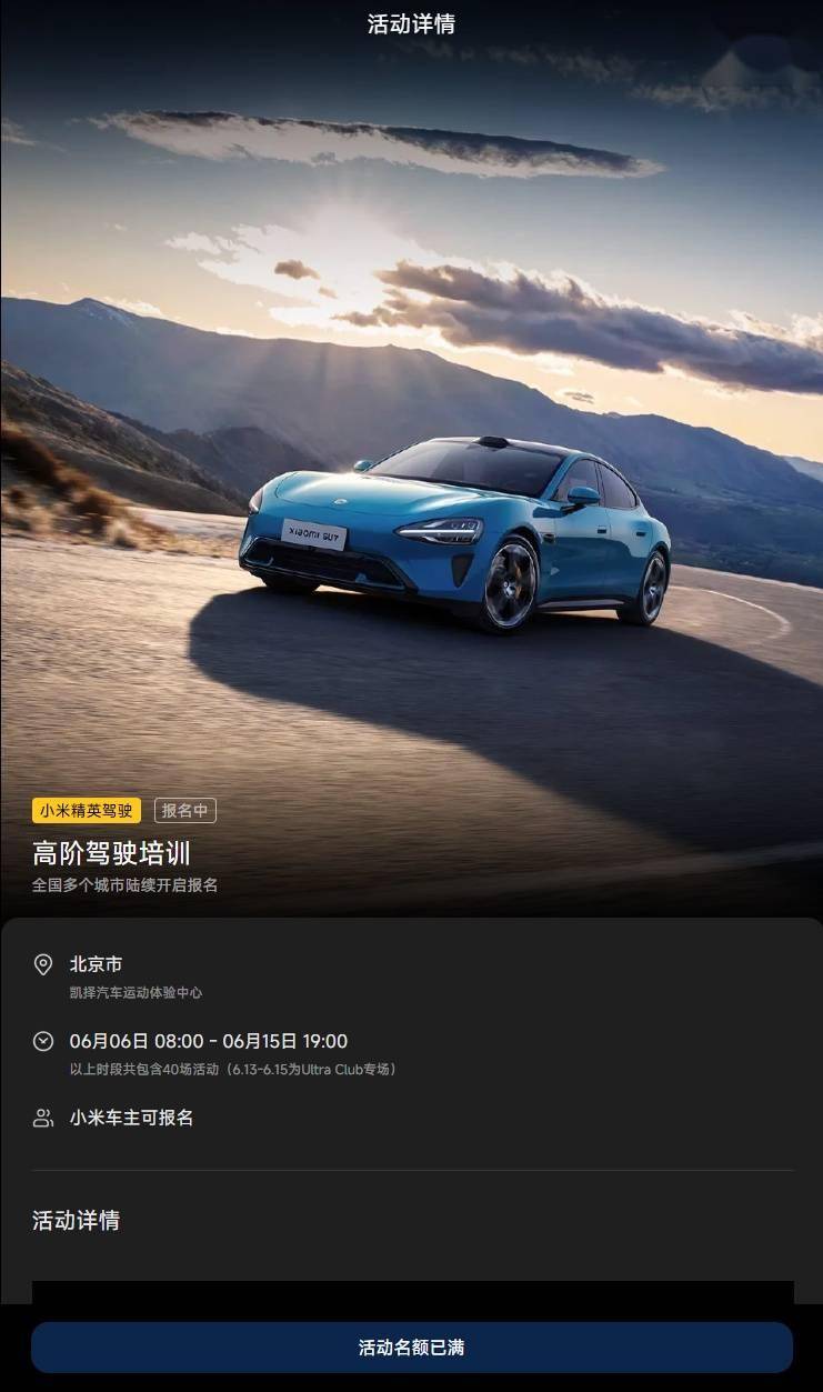 據小米官方介紹,這場高階駕駛培訓不僅由經驗豐富的精英教練團隊親自授課,還安排了與冠軍車手的面對面交流環節,旨在全方位提升車主的駕駛技能和理論知識。然而,令人遺憾的是,報名活動剛開始不久,名額便迅速被搶空,小米方面并未透露此次活動的具體名額數量。