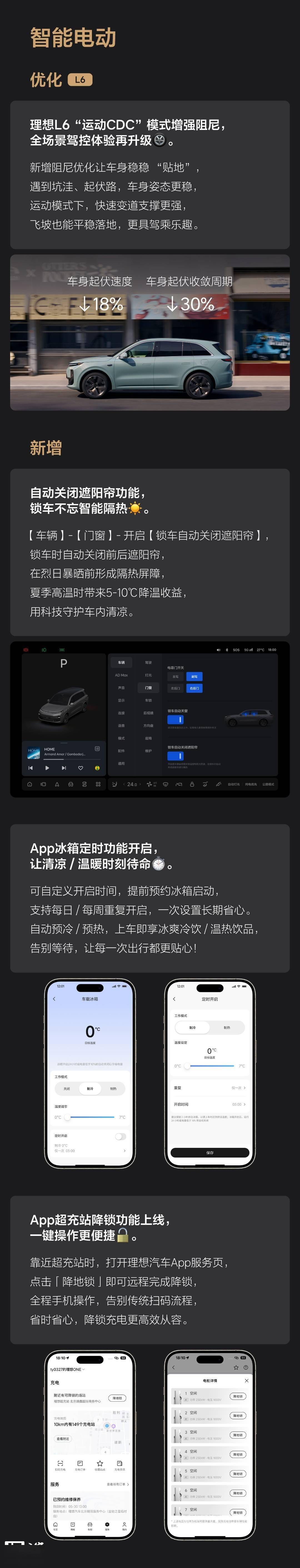 在音響系統方面,理想汽車推出了前后雙音區音響系統,前排可以享受音樂,后排則可以觀看動畫片,雙音區音量支持獨立調節,為全家提供更加舒適的聽覺體驗。在駕駛模式上,理想L6新增了運動CDC模式,增強了車身穩定性。同時,新增的自動關閉遮陽簾功能能夠在鎖車時自動關閉前后遮陽簾,形成隔熱屏障,夏季高溫時可為車內帶來5-10℃的降溫效果。
