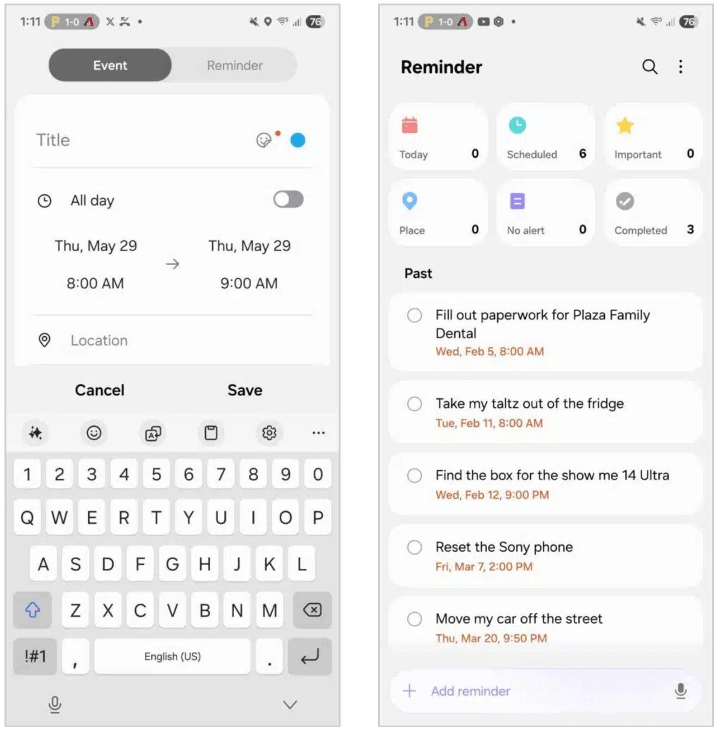 One UI 8還對提醒與日歷應用進行了全面煥新。提醒事項現在支持在頂部顯示分類,用戶可以輕松隱藏以獲得簡潔視圖。添加提醒的過程也變得更為迅速,支持建議和語音輸入功能。在日歷中,用戶可以直接添加提醒,通過拖放重新安排日程,并獲得事件名稱建議,使日程管理更加便捷。
